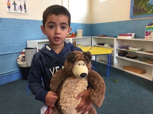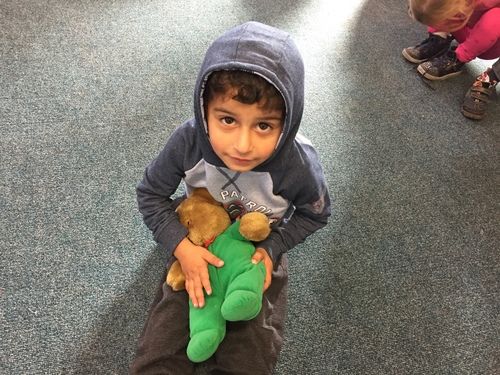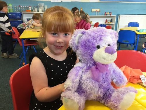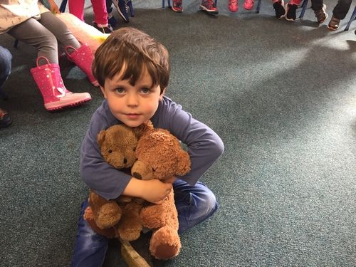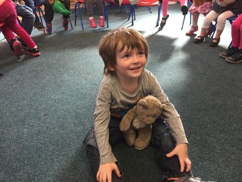 'My teddy is called Lucas. He is 5 years old and he lives in the present. He likes letters, he finds treasures in the leaves!'