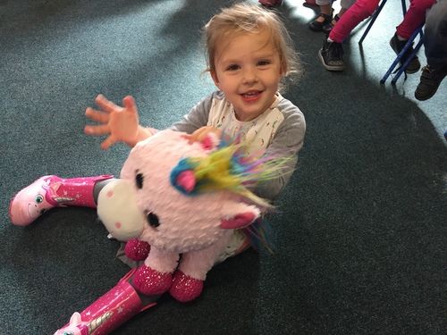 'My unicorn is a girl and her name is Din Din. She likes dinosaurs, her hair is pink, blue, green and red. She has a corn on her head, and has magic. Horsey is her favourite!'